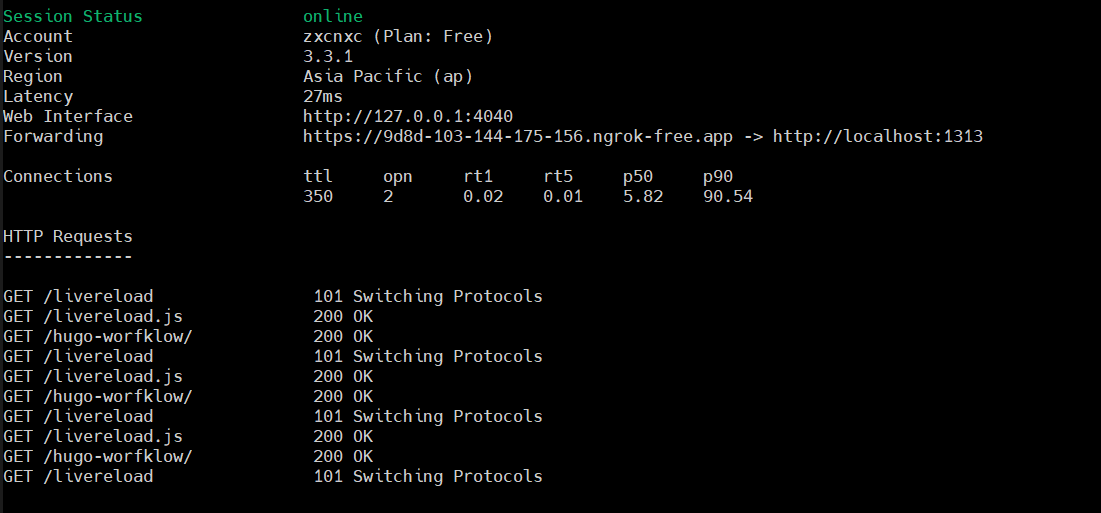 ngrok config add-authtoken <token>Using two tabs, I run the following command to use ngrok and hugo: