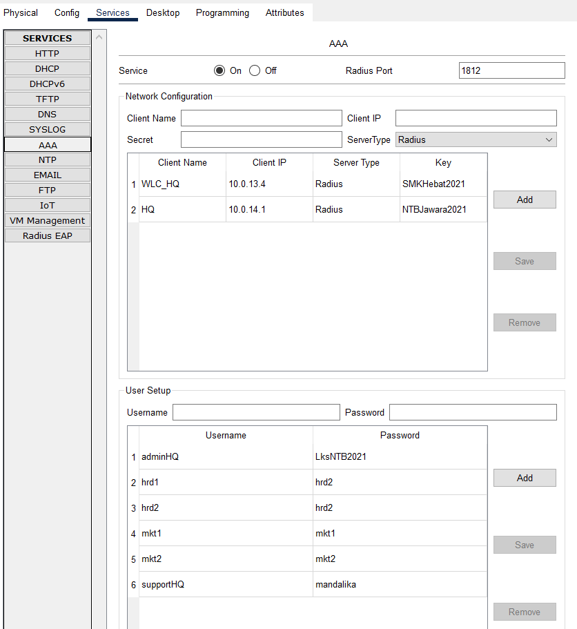 - Enable AAA service and configure Network Configuration with Server Radius type and User Setup as given in the table below: