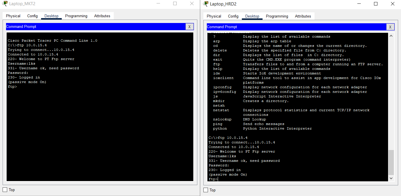 - Access the FTP service on the BRANCH Server using the FTP Client by entering the address 10.0.15.4 from the End Device on the HRD and MARKETING VLAN of HQ MATARAM.