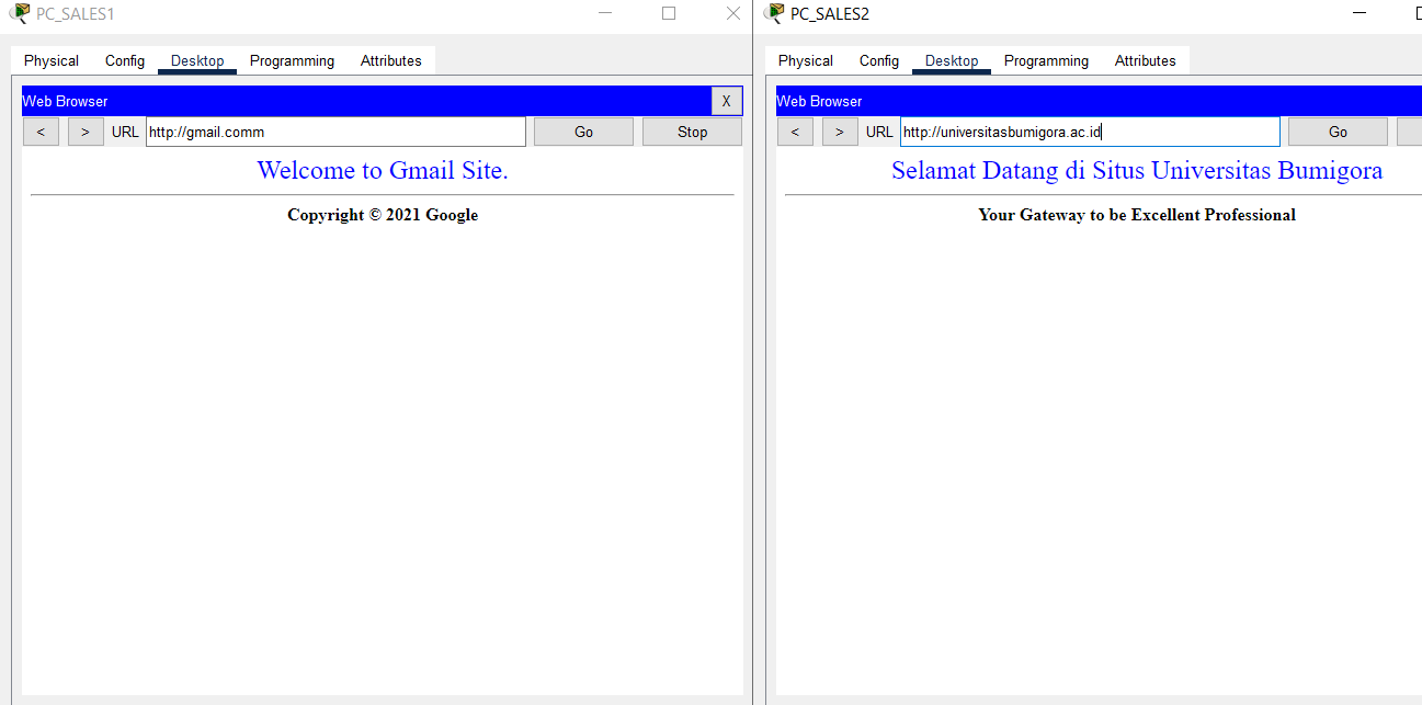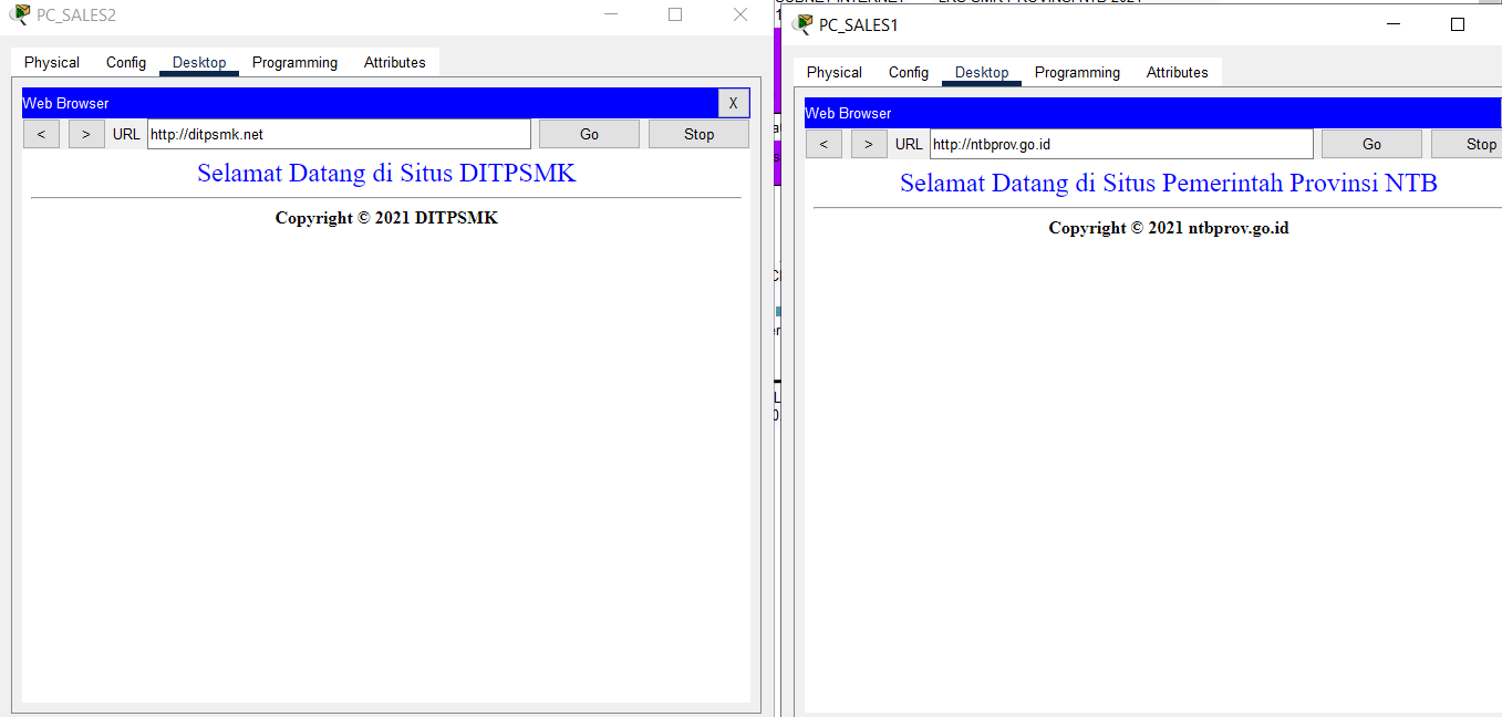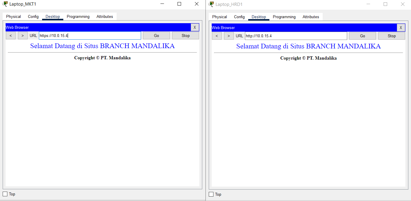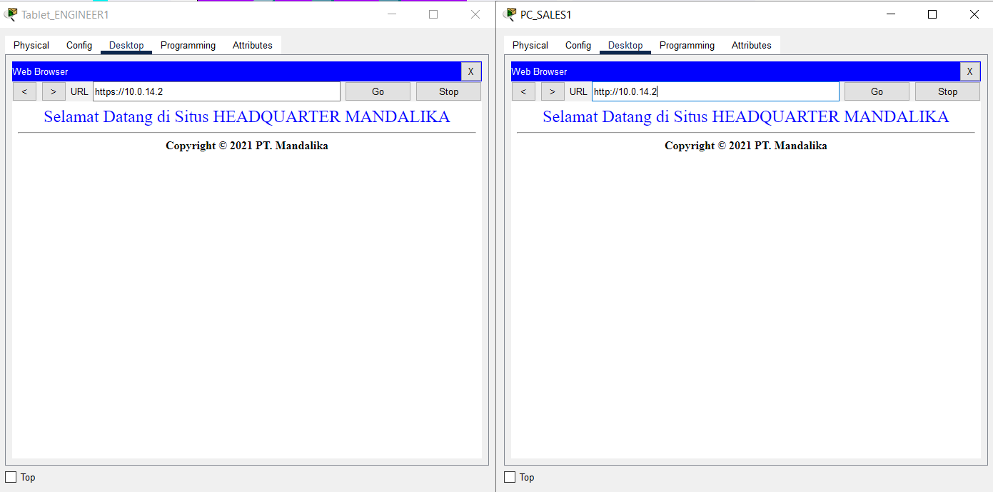- Verification of access to HTTP and HTTPS services located at SERVER HQ MATARAM using a browser by accessing the addresses http://10.0.14.2 and https://10.0.14.2 from the End Device located on VLAN SALES and WLAN ENGINEER from BRANCH SUMBAWA.