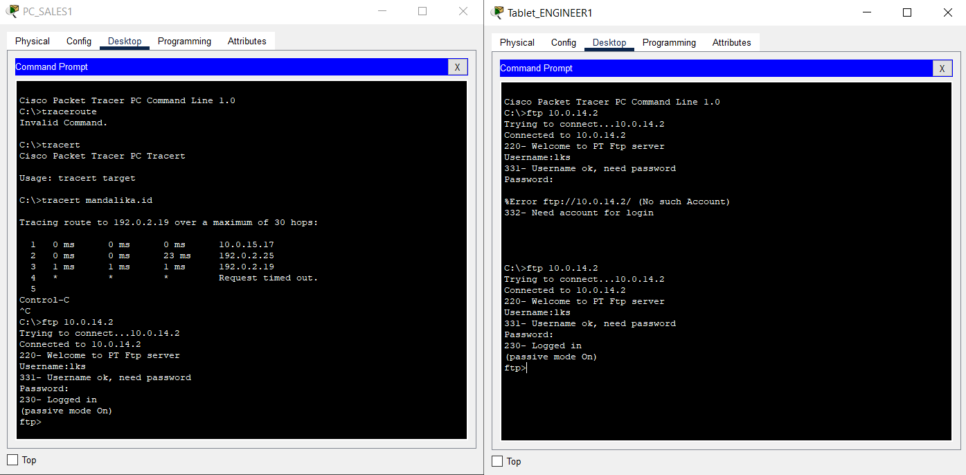 - Access the FTP service on the HQ Server using the FTP Client by entering the address 10.0.14.2 from the End Device on the SALES VLAN and WLAN ENGINEER of BRANCH SUMBAWA.