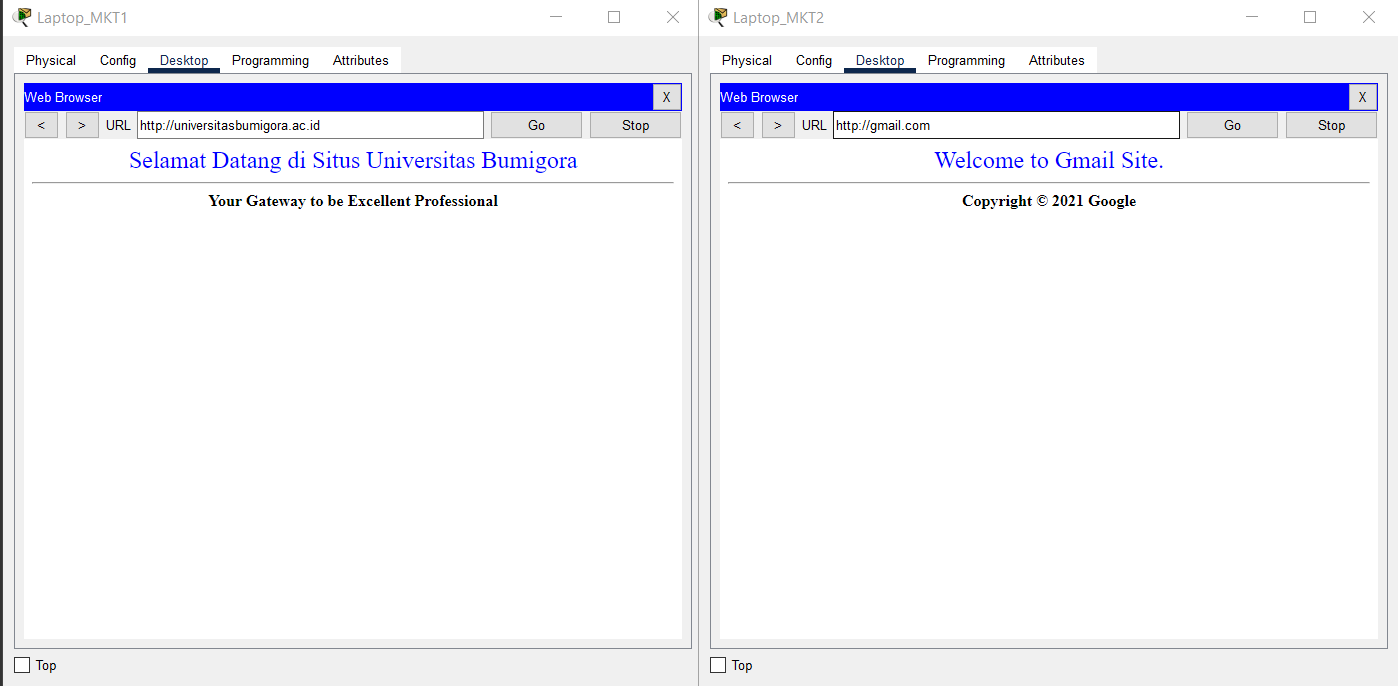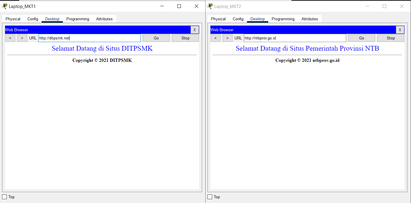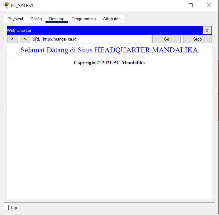 - Use a browser to verify access to HTTP and HTTPS services on the HQ MATARAM Server by entering the addresses http://10.0.14.2 and https://10.0.14.2 from the End Device on VLAN SALES and WLAN ENGINEER from BRANCH SUMBAWA.