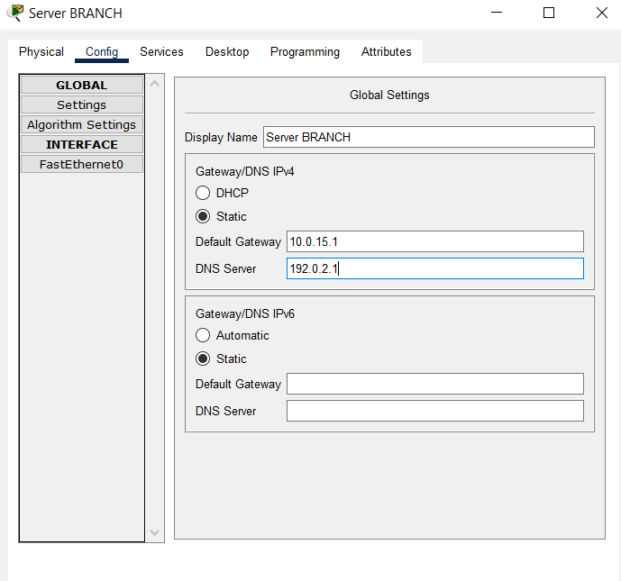 - Configure the IP addressing on the GigabitEthernet0/1 interface connected to the HQ Server with the first IP address from subnet 10.0.14.0/30.